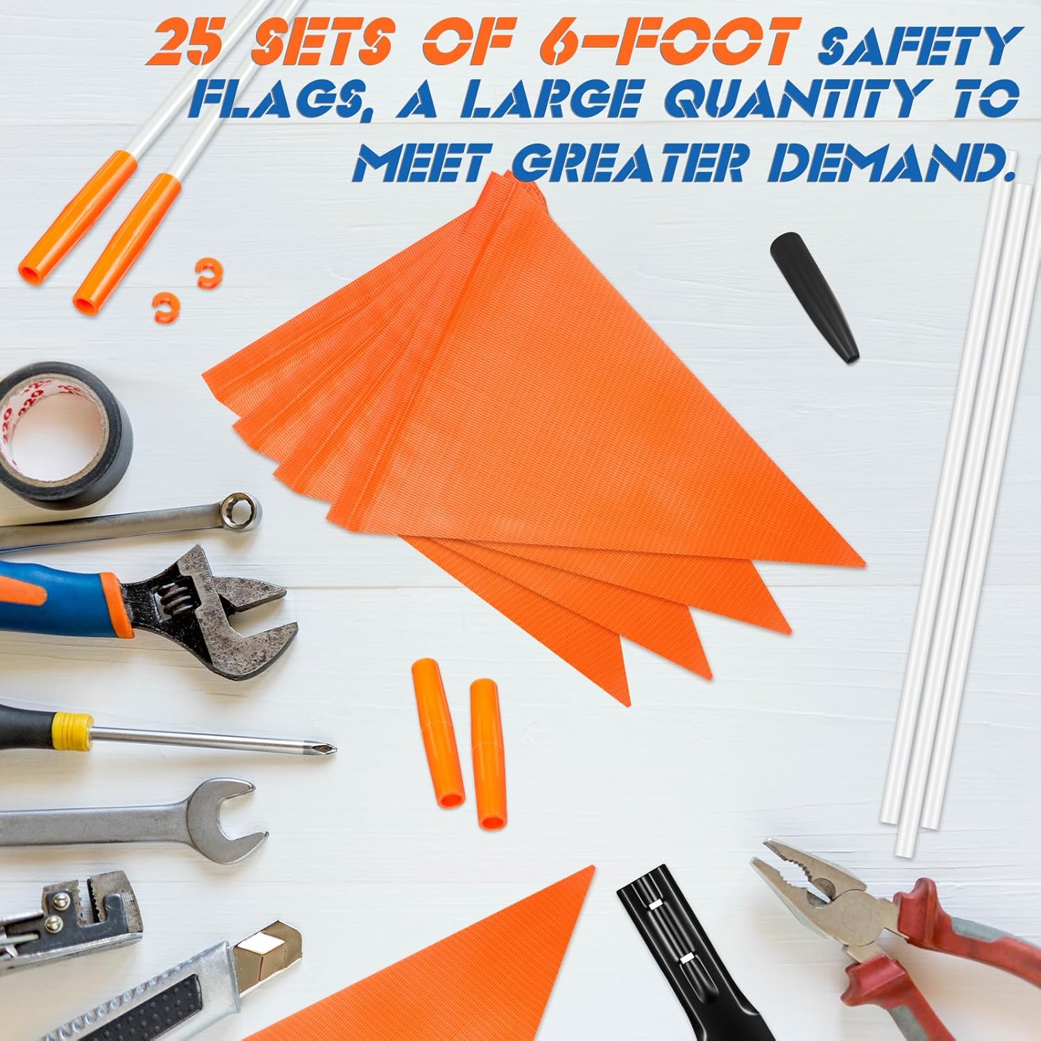Features: Featuring vibrant warning colors and reflective materials, this bike flag maintains high visibility both day and night. Its 6-foot height ensures the flag is clearly identifiable in traffic, providing additional visual warning to bikes, trailers, and work vehicles, helping to reduce blind spot risks. The flags feature prominent, universally recognized warning symbols that convey a clear "keep your distance" visual signal to pedestrians and vehicles in the vicinity. This intuitive design helps improve communication efficiency and safety on public roads. Specifications: Material: fiberglass Color: orange, red Size: Flagpole: 35 cm Package includes: 125 x White flagpole 100 x Red connector 25 x Black iron sheet 50 x Clip 25 x Piercing the ground 25 x Banner Notes: Manual measurement, please allow slight errors on size. The color may exist a slight difference due to different screen displays