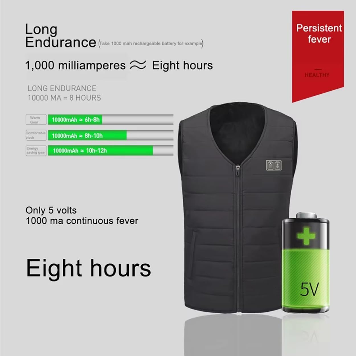 - Great choice for anyone who loves to stay warm such as hunting, fishing, traveling to cold places, winter golf, cold soccer or football games.providing you with good comfort and protection.SpecificationsName:Heating Thermal Underwear VestMain fabric:Polyester Fiber (Polyester)Color: BlackApplicable People:Men/WomenTemperature Range:High (red 45℃), medium (blue 35℃), and low (green 25℃).Fever Area: 12 ZonesPackage included1* Heating Thermal Underwear Vest(Power Bank is not included)How To Use?1.Take Out The Usb Plug From Your Pocket And Plug It Into The Charging Treasure Usb Socket.2.Long Press The Switch Button For 3-5 Seconds (Press And Hold) To Switch On And Off The Machine, And Multiple Buttons Can Control The Heating Parts And Temperature Independently In Different Areas.3.After Starting Up, Press The Switch Button Briefly To Switch The Temperature (Divided Into High, Low And High Grades) .Washable:① Do Not Tear Vigorously.② Before Washing, Take Out The Battery, Insert The Usb Plug Into Your Pocket And Zip It Up.③Just Air Dry. Do Not Bleach, Iron, Dry-Clean.